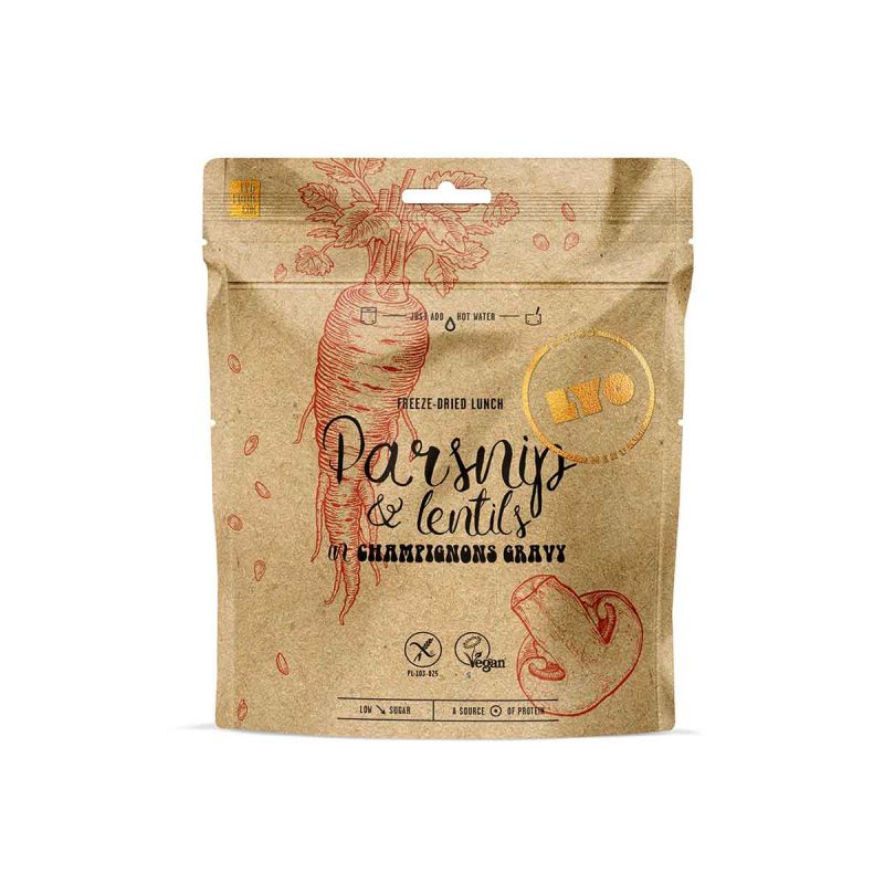 Esta comida liofilizada combina el sabor suave de la chirivía, la riqueza de las lentejas rojas y la delicadeza de una salsa cremosa de champiñones, realzada con cúrcuma, rábano picante y pimienta. Servido con mijo y aderezado con perejil, este plato completo y sabroso es 100 % vegetal, sin gluten y sin lactosa.