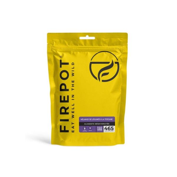 La mezcla de verduras a la Toscana es una receta con sabores italianos preparada por una marca inglesa, Firepot. Los ingredientes se cocinan juntos antes de ser deshidratados. Este proceso permite conservar los sabores al tiempo que aligera la receta. ¡Perfecto para viajar ligero!
