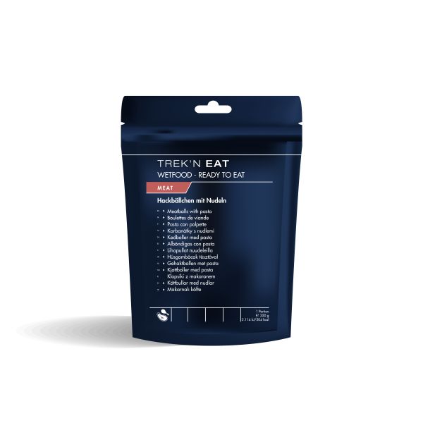 Estas albóndigas de carne de pollo y ternera están acompañadas de pasta. Lista para comer, esta porción de 350 g se conserva 3 años después de su fabricación.
