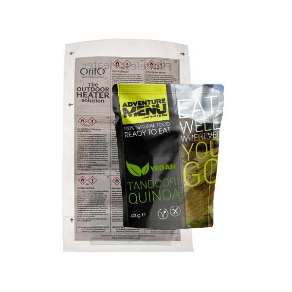 Este plato de 400 g de Tandoori Quinoa es un plato esterilizado vegano acompañado de un calentador sin llama. Un plato autocalentable de la marca Adventure Menu listo en 12 minutos.