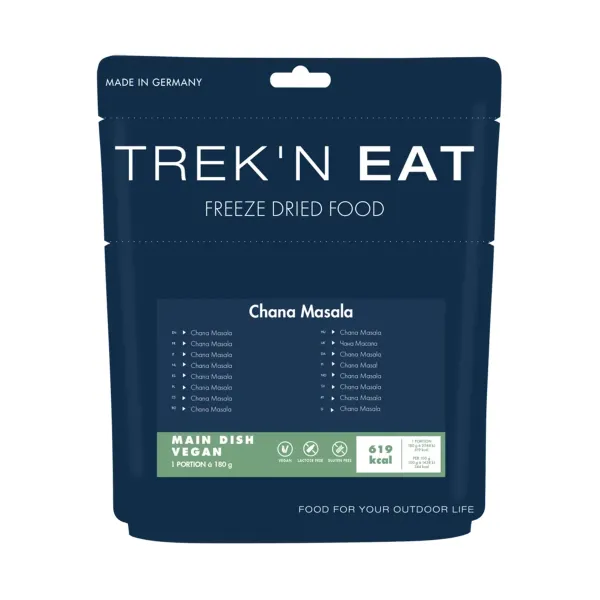 El Chana Masala de Trek'n Eat es un plato vegano completo inspirado en las tradiciones culinarias de India y Pakistán. Combina garbanzos, arroz y una hábil mezcla de especias para una receta sabrosa, reconfortante y nutritiva, ideal tras una jornada de esfuerzo.