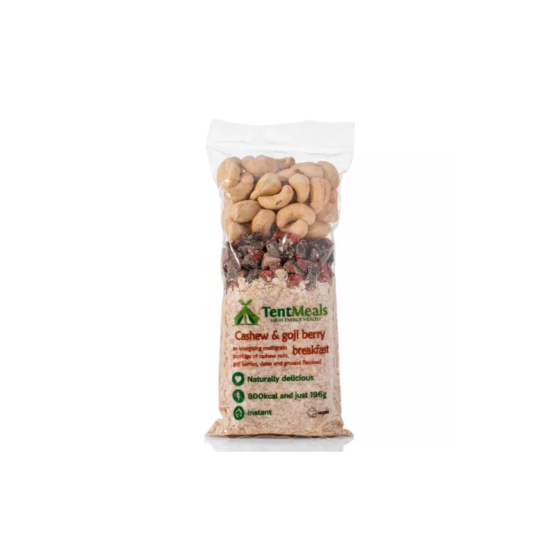 Es un desayuno de alto valor energético, 800 kcal, que le aportará una energía equilibrada en carbohidratos, proteínas y lípidos. Esta comida compuesta de frutas secas, anacardos, avena y bayas de goji está envasada en una pequeña bolsa que cabe en la mano. Se deslizará entonces fácilmente en su mochila durante su trekking o raid.